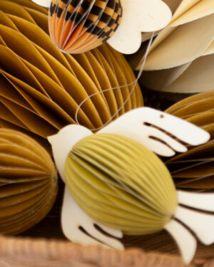 Bungalowin pakkauksessa on kaksi lintukoristetta. Koristeet ovat paperia ja niissä on keskellä hunajakennorakenne.Hunajakenno kiinnitetään magneetilla auki. Sen saa siis myös kätevästi suljettua koristeiden säilytystä varten.