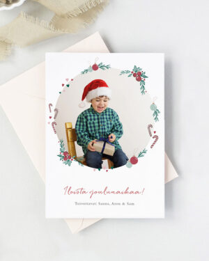 Kauniissa joulukortissa on tilaa yhdelle kuvalle, joka voi olla värillinen tai mustavalkoinen. Kortin kääntöpuoli on valkoinen, joten sinne voi halutessaan kirjoittaa henkilökohtaiset tervehdykset käsin! Kirjekuoret sisältyvät hintaan.