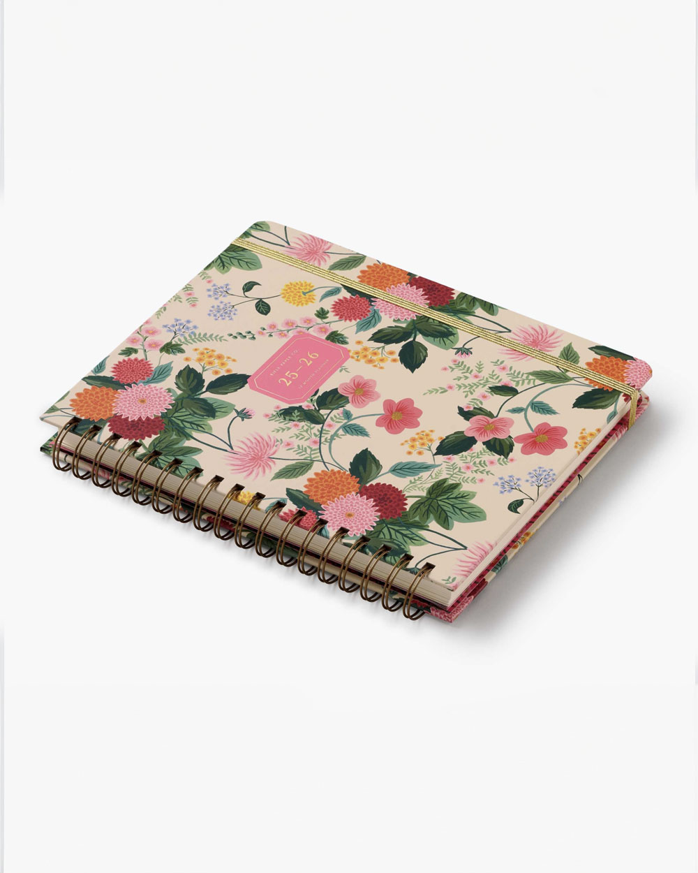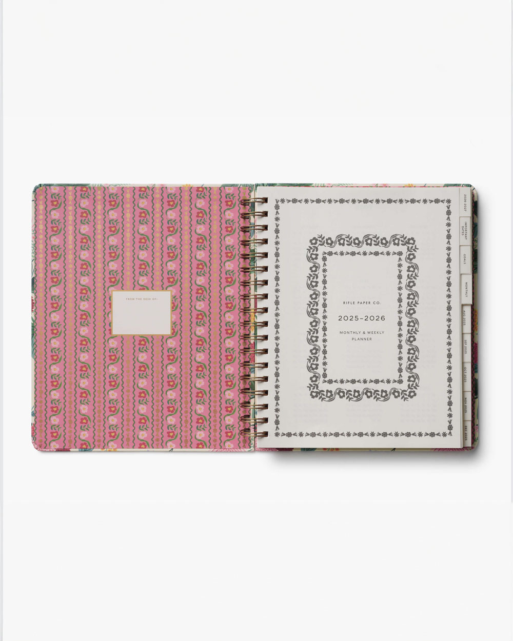 Rifle Paper co:n suosittu kalenteri 17 kuukaudelle, alkaen elokuusta 2025 ja päättyen joulukuuhun 2026. Kattavasta kalenterista löytyy kätevästi kaikki: Niin kuukausi- kuin viikkonäkymät, inspiroivia lausahduksia, tilaa tärkeille päivämäärille, yhteystiedoille ja muistiinpanoille, tasku irtolappusille sekä 2 arkkia ihania tarroja.