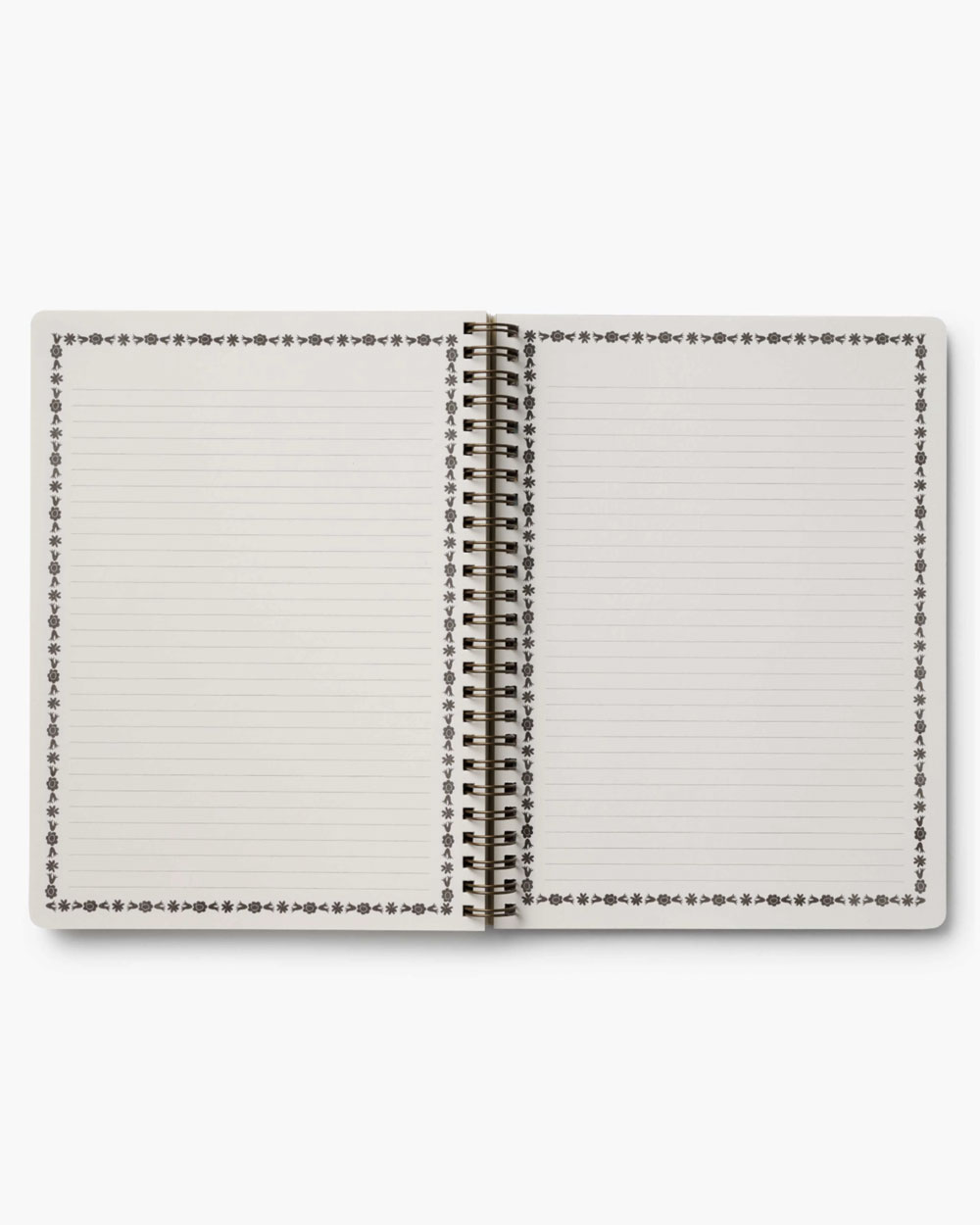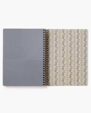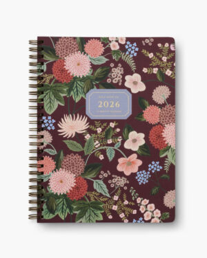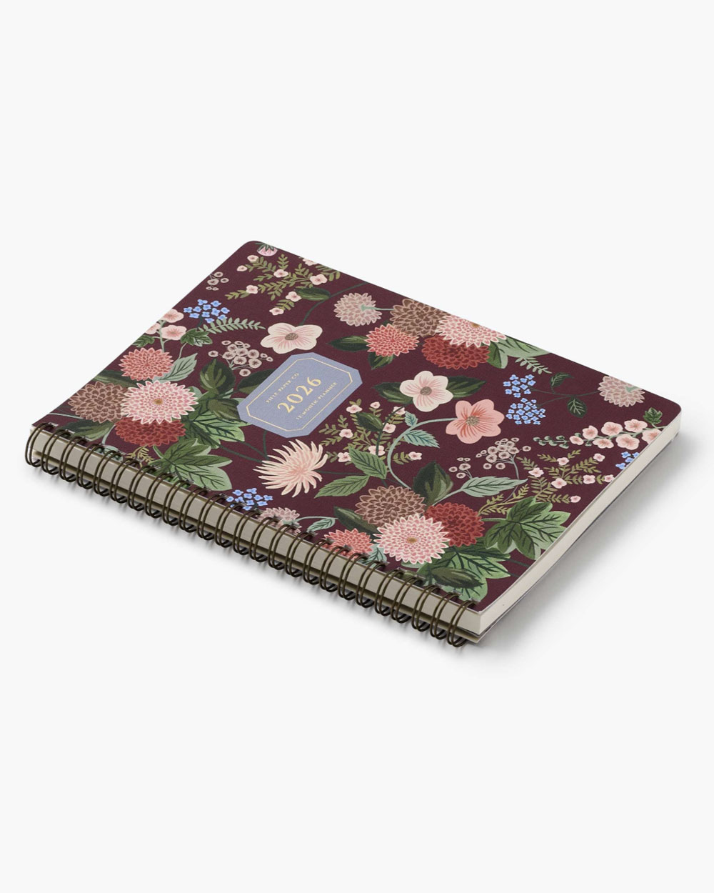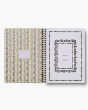 Kierresidottu, paperikantinen kalenteri vuodelle 2026. Kannessa kukkakuviot ja kultafolioitu vuosiluku.