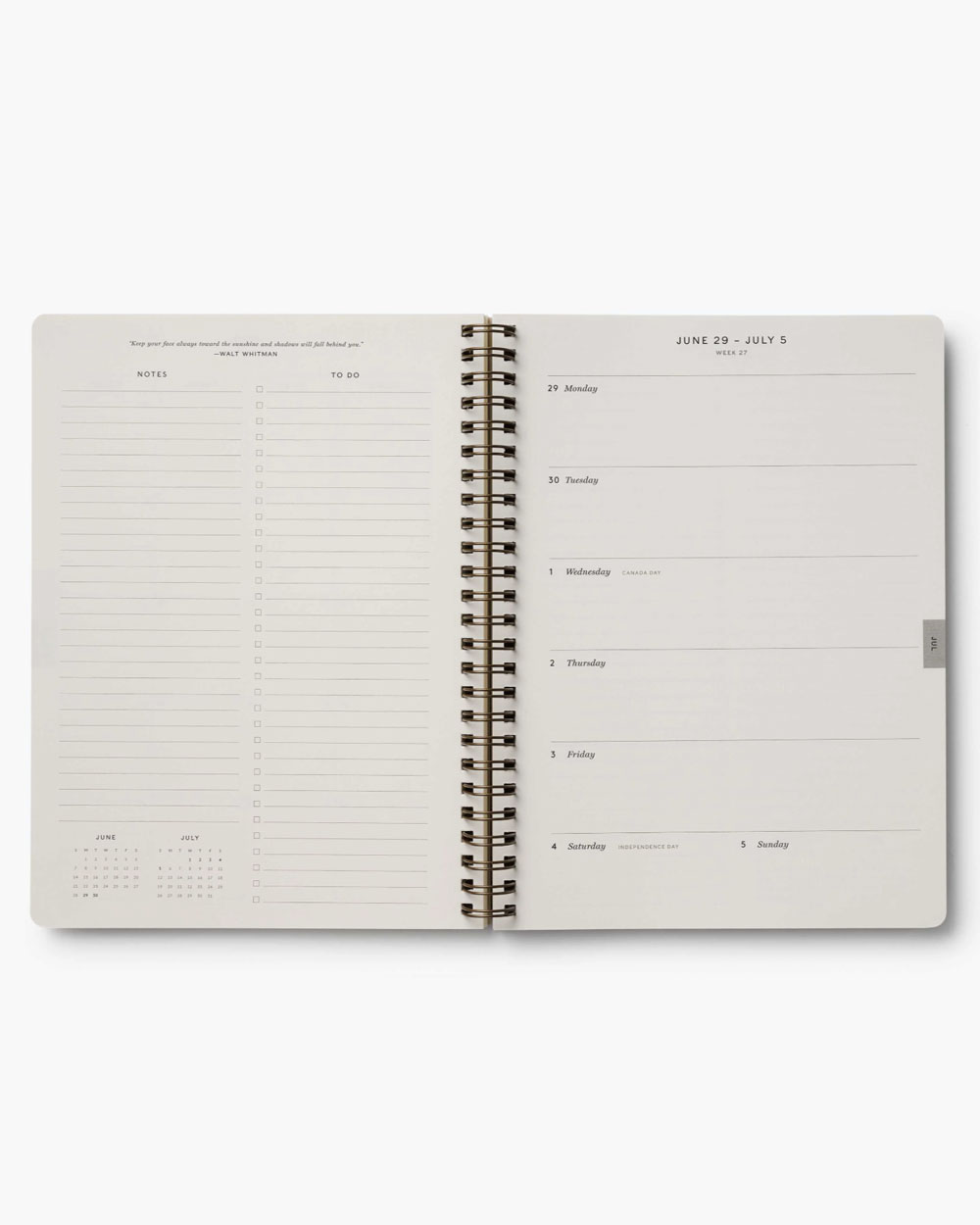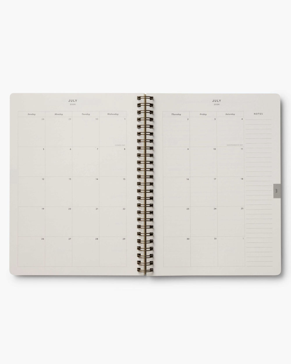 Sisältä löytyy kuukausi- ja viikkonäkymät, runsaasti tilaa muistiinpanoille ja säilytystaskuja tärkeiden lappusten tallettamiseen.
