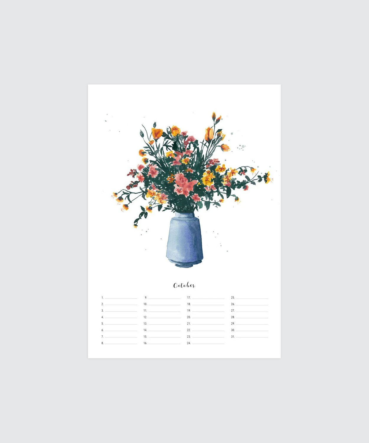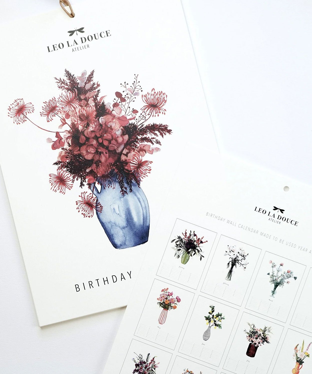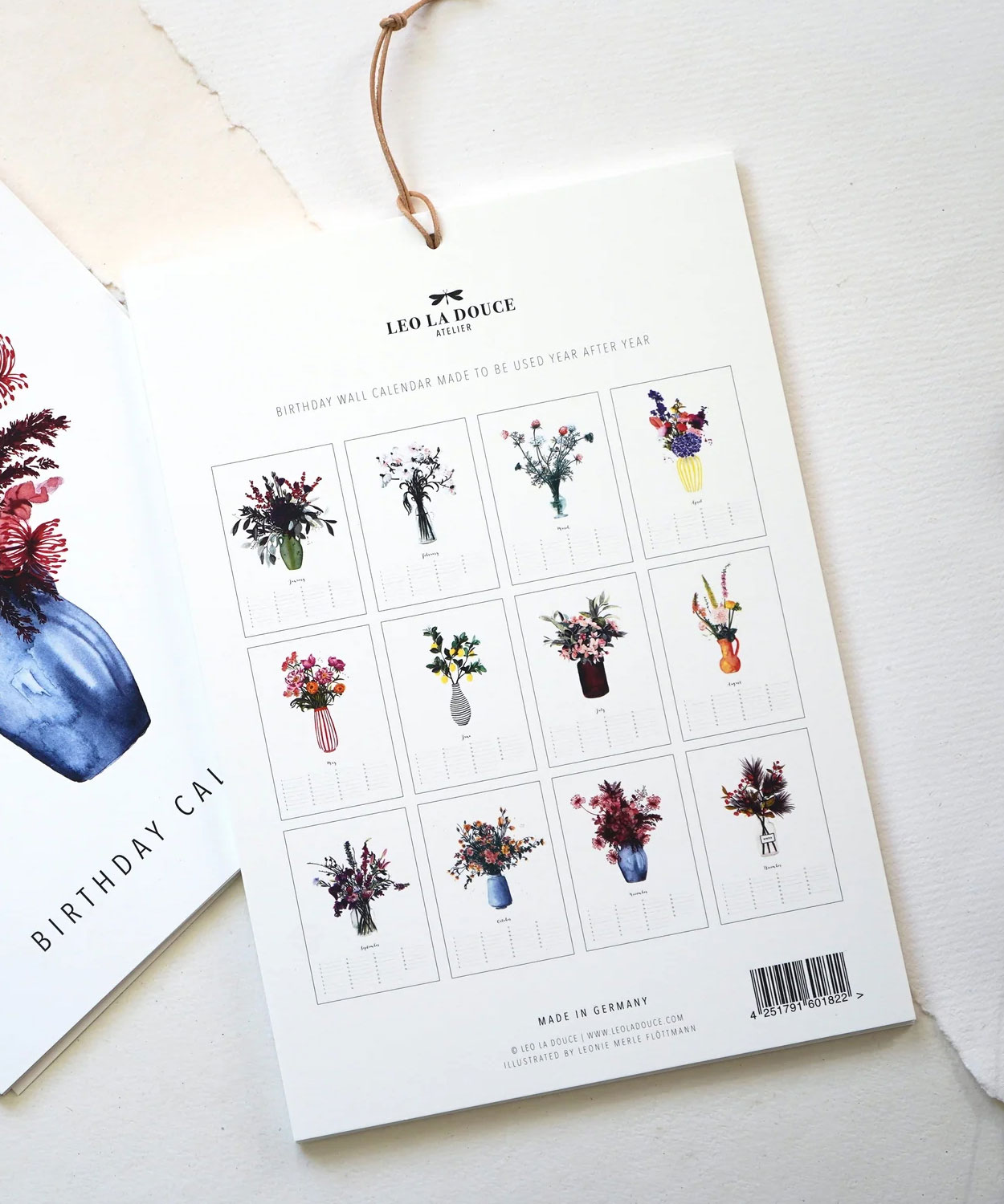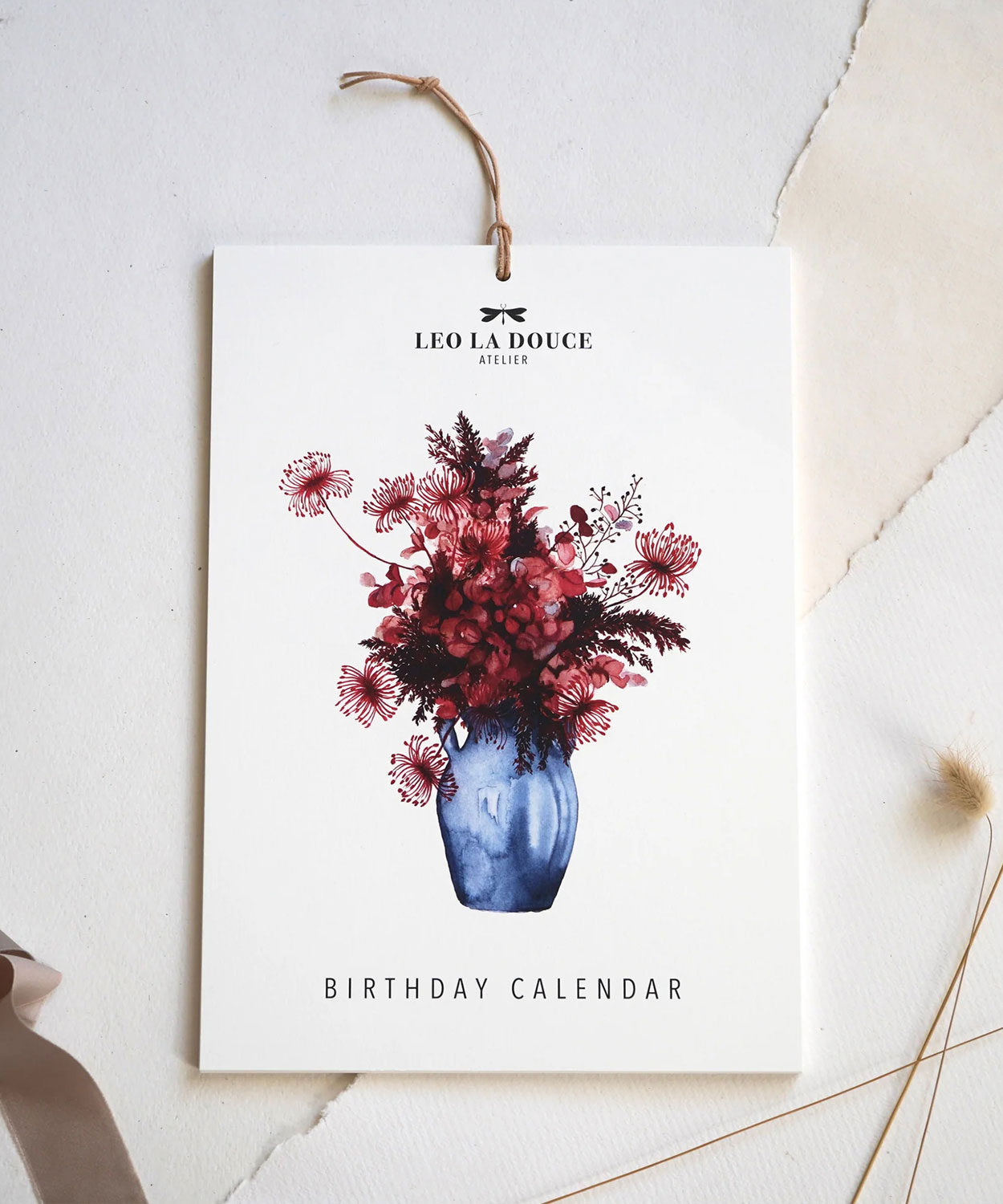 Syntymäpäiväkalenterissa on jokaiselle kuukaudelle numeroinnit ja tilaa päivänsankarin nimen kirjoittamiseen – tai vuosipäivän, kalenteri sopii mainiosti kaikille vuosittain samalla päivämääränä toistuville juhlille! Kuvituksien kimput ovat inspiroituneet vaihtuvien vuoden aikojen värimaailmoista.
