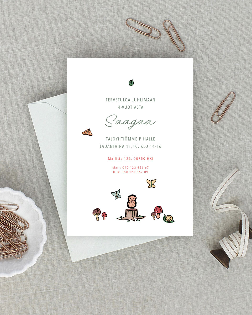 Kauniilla persoonallisilla korteilla kutsut ystävät ja läheiset juhlimaan merkkipäivääsi. Kutsukortit on painettu 300g mattakartongille. Kokonaisuuteen kuuluu kirjekuoret valitsemassasi sävyssä.