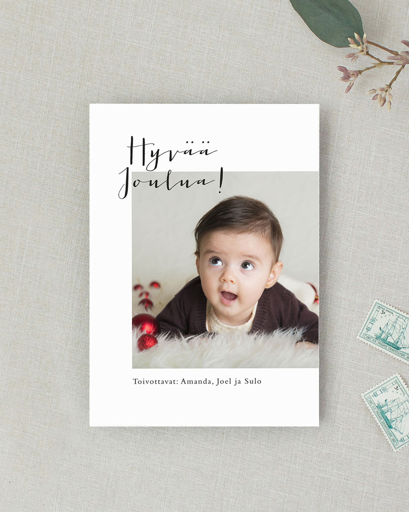 Kauniissa joulukortissa on tilaa yhdelle kuvalle, joka voi olla värillinen tai mustavalkoinen. Kortin kääntöpuoli on valkoinen, joten sinne voi halutessaan kirjoittaa henkilökohtaiset tervehdykset käsin! Kirjekuoret sisältyvät hintaan.