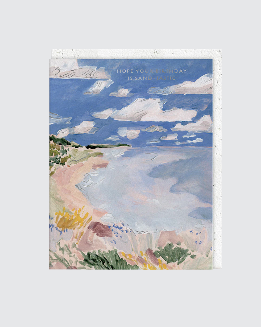 Seedlingsin kortissa lukee ”Hope your birthday is sand-tastic”. Se luo sanaleikin, jossa fantastisesta on muuttunut viittaus hiekkarantaan eli rentoon, lämpimään ja kiireettömään tunnelmaan.