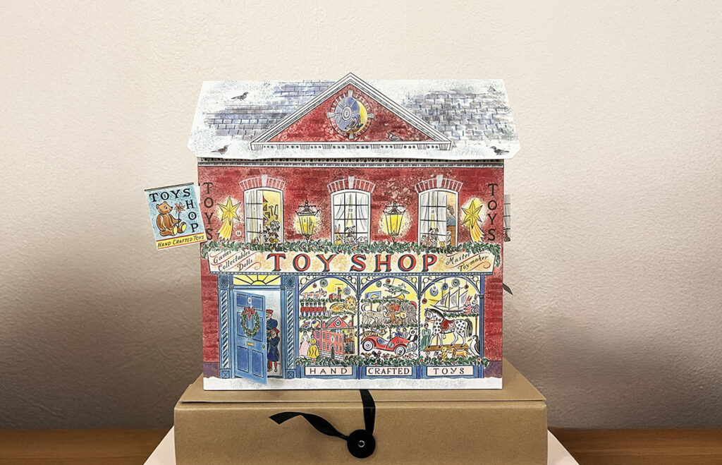 Emily Suttonin kauniisti kuvitettaman adventtikalenterin saa asetettua pöydälle pystyyn. Lumisen kaupunkimaiseman keskellä on koristeltu joulukuusi ja kauppojen ikkunoista voi ihania yksityiskohtia. High steet -joulukalenteri käykin ihan joulukoristeesta!