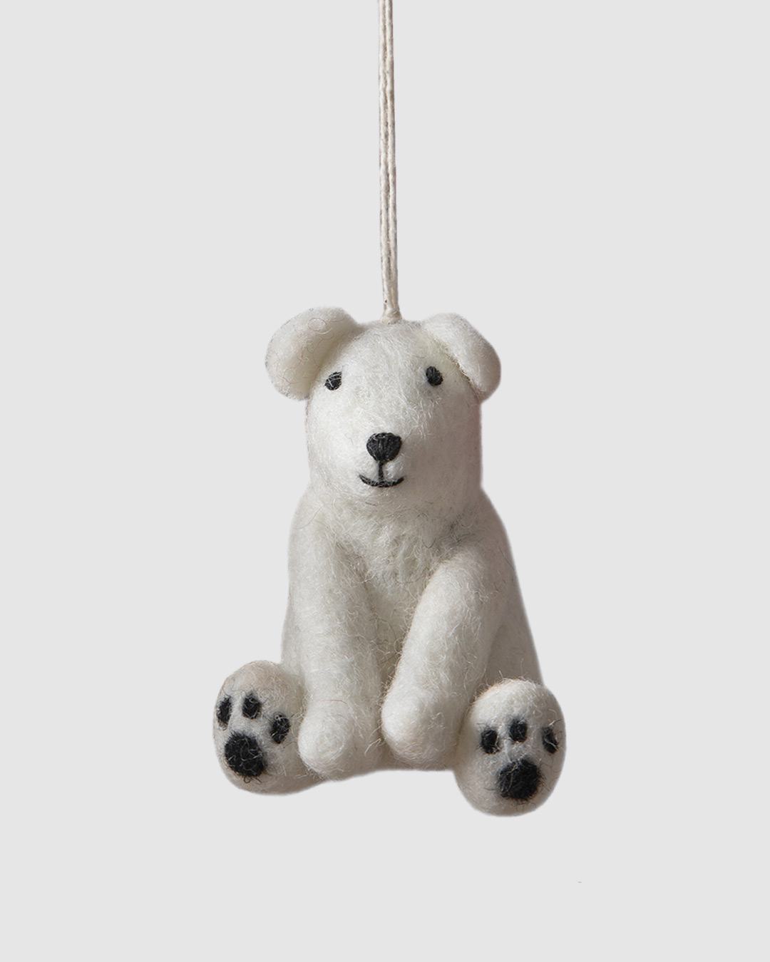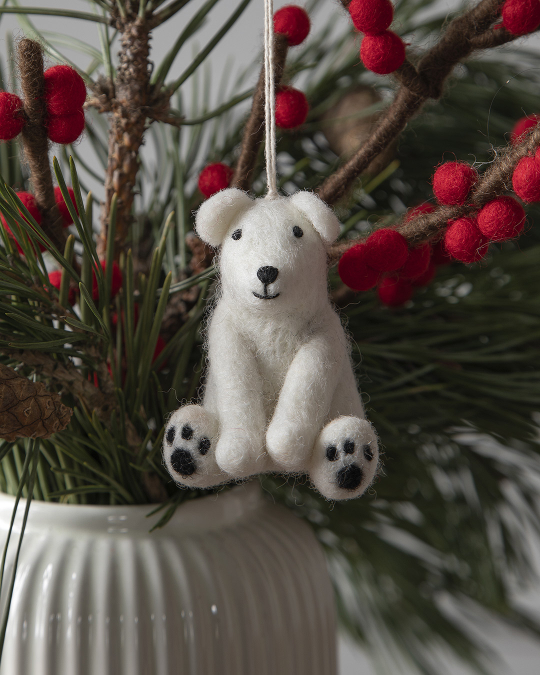 Sympaattinen jääkarhu on valmistettu lampaanvillasta. Huopakoristeessa on valmiina puuvillainen ripustuslenkki. Jääkarhun korkeus noin 8 cm.