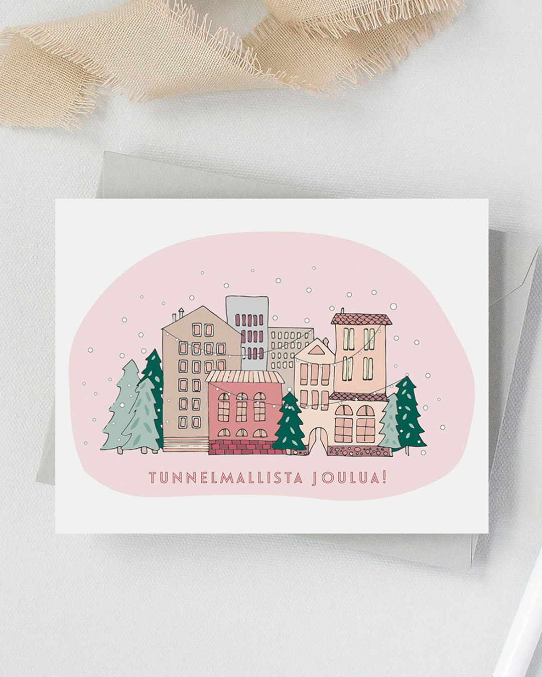 Tämän kortin kauniit kuvitukset ovat painostudiomme suunnittelijan Pepin käsialaa. Ideasta valmiiseen korttiin on monta työvaihetta. Yleensä Peppi aloittaa suunnittelun piirtämällä ja maalaamalla kuvioaiheita käsin. Koneella kuvitukset viimeistellään, sommitellaan korttikokoon ja yhdistetään fontteihin.