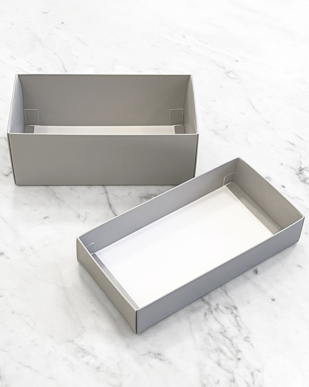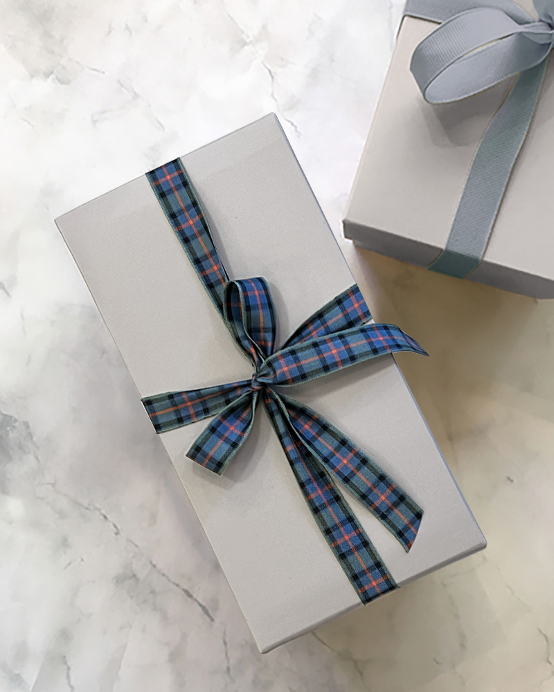 Kaunis kannellinen, vaalean puuterin värinen laatikko postitetaan litteänä, eli se tulee itse taitella kokoon. Haluamasi lahjanauhan voit ostaa erikseen täältä.