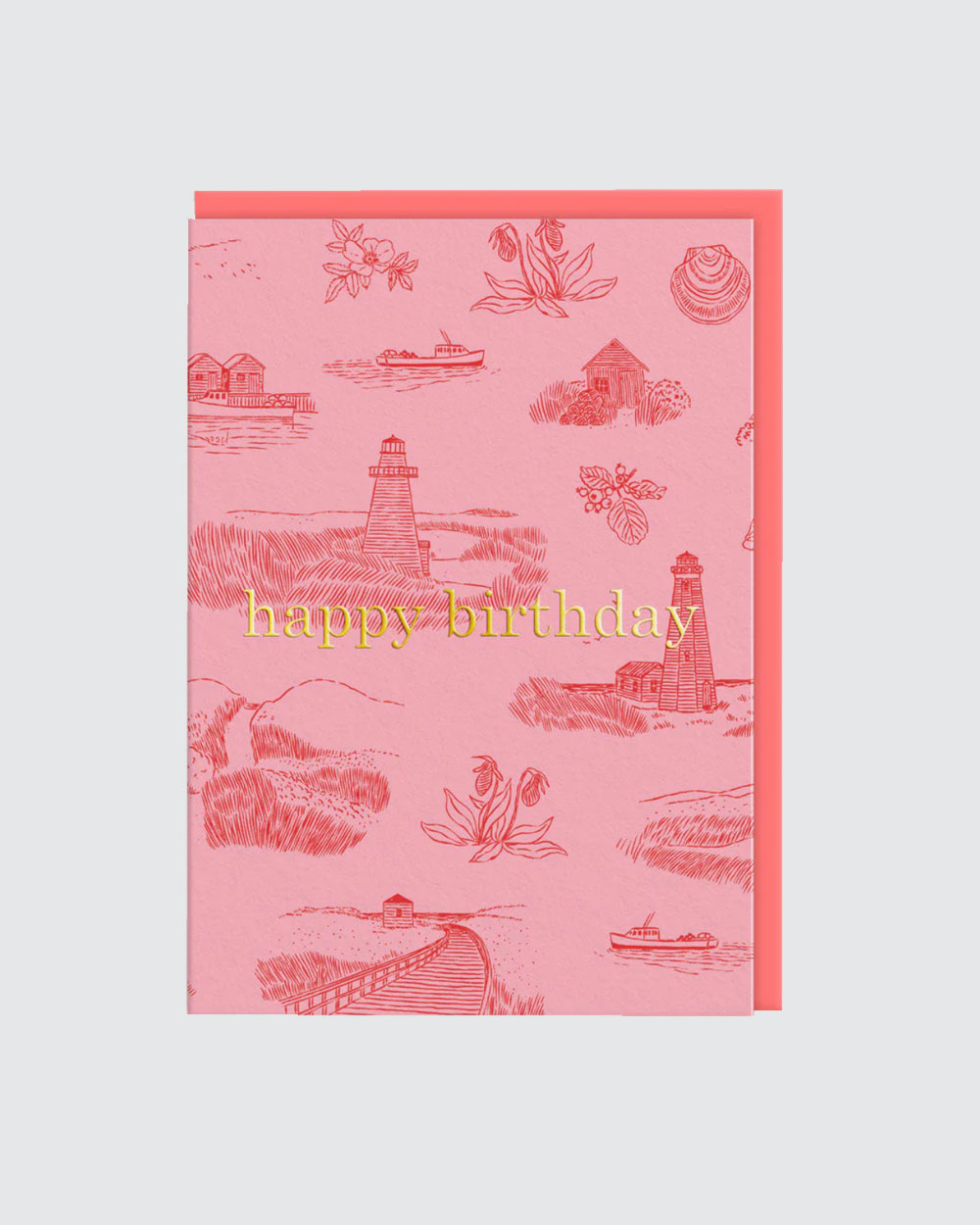 Emily Taylorin suunnittelema syntymäpäiväkortti majakkateemaisella kuvituksella. Kortti on sisältä tyhjä ja mukana tulee kirjekuori.