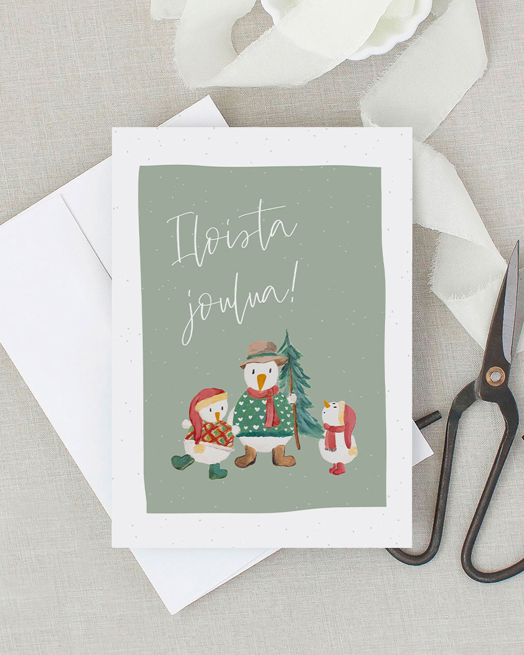 Tämän kortin kauniit kuvitukset ovat painostudiomme suunnittelijan Pepin käsialaa. Ideasta valmiiseen korttiin on monta työvaihetta. Yleensä Peppi aloittaa suunnittelun piirtämällä ja maalaamalla kuvioaiheita käsin. Koneella kuvitukset viimeistellään, sommitellaan korttikokoon ja yhdistetään fontteihin.