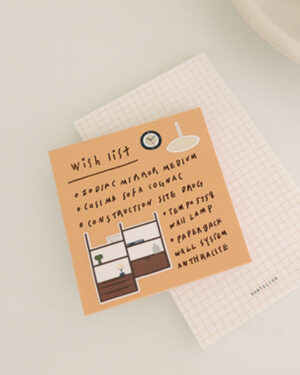 Suatelierin kuvitetussa tarra-arkissa on yhteensä 38 tarraa. Arkissa on montaa eri mallista ja kokoista tarraa, joiden teemana on 1900-luvun puolivälin moderni sisustustyyli.