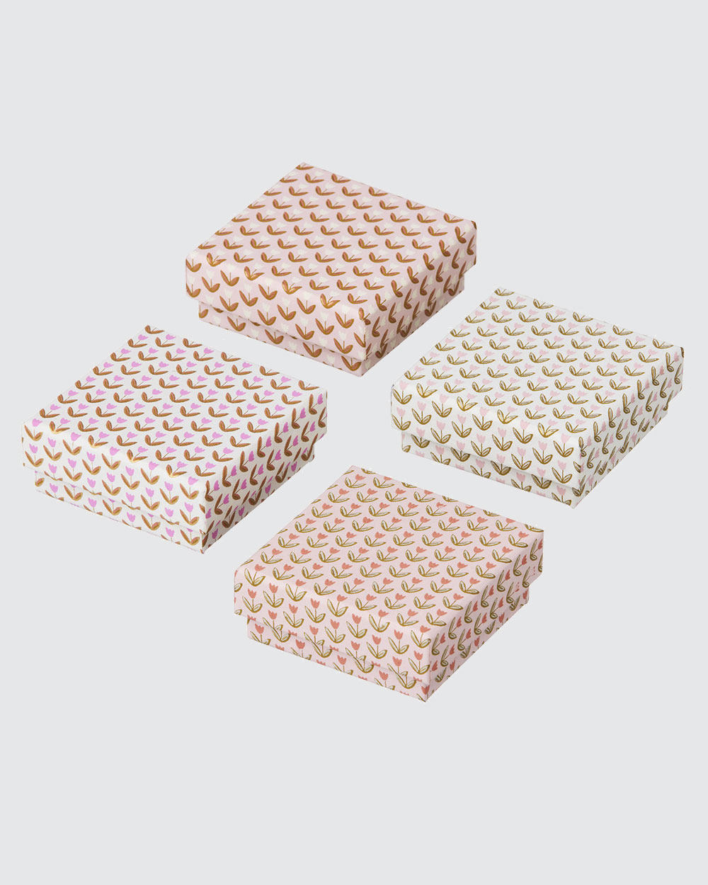 Kauniisti kuvioidut ja keskenään yhteensopivat laatikot ovat kätevä ratkaisu pienten tavaroiden tallessa pitämiseen kotona tai toimistolla. Tyylikkäät laatikot käyvät myös hyvin lahjojen helppoon pakkaamiseen. Kun valmiiksi kuviolliseen boksiin lisää rusetin päälle, niin näyttävä pakkaus on jo valmis!