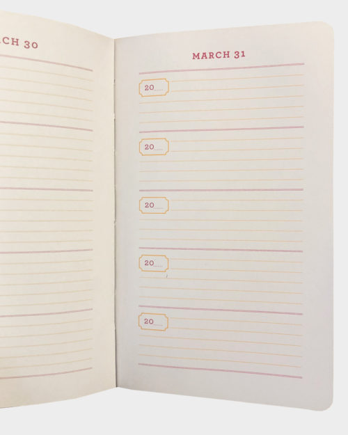 Päiväkirjassa on kovat kannet, joiden sävy taittaa vaaleaan liilaan ja kultafolioidut, kimaltavat tekstit. Sisäsivut ovat luonnonvalkoiset, joilla numeroinnit ja riviviivat raikkaan pinkillä ja oranssilla.