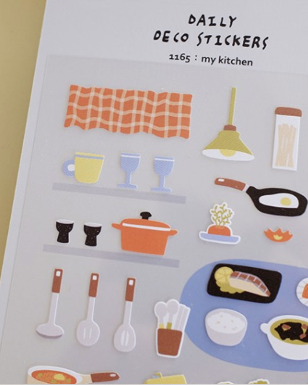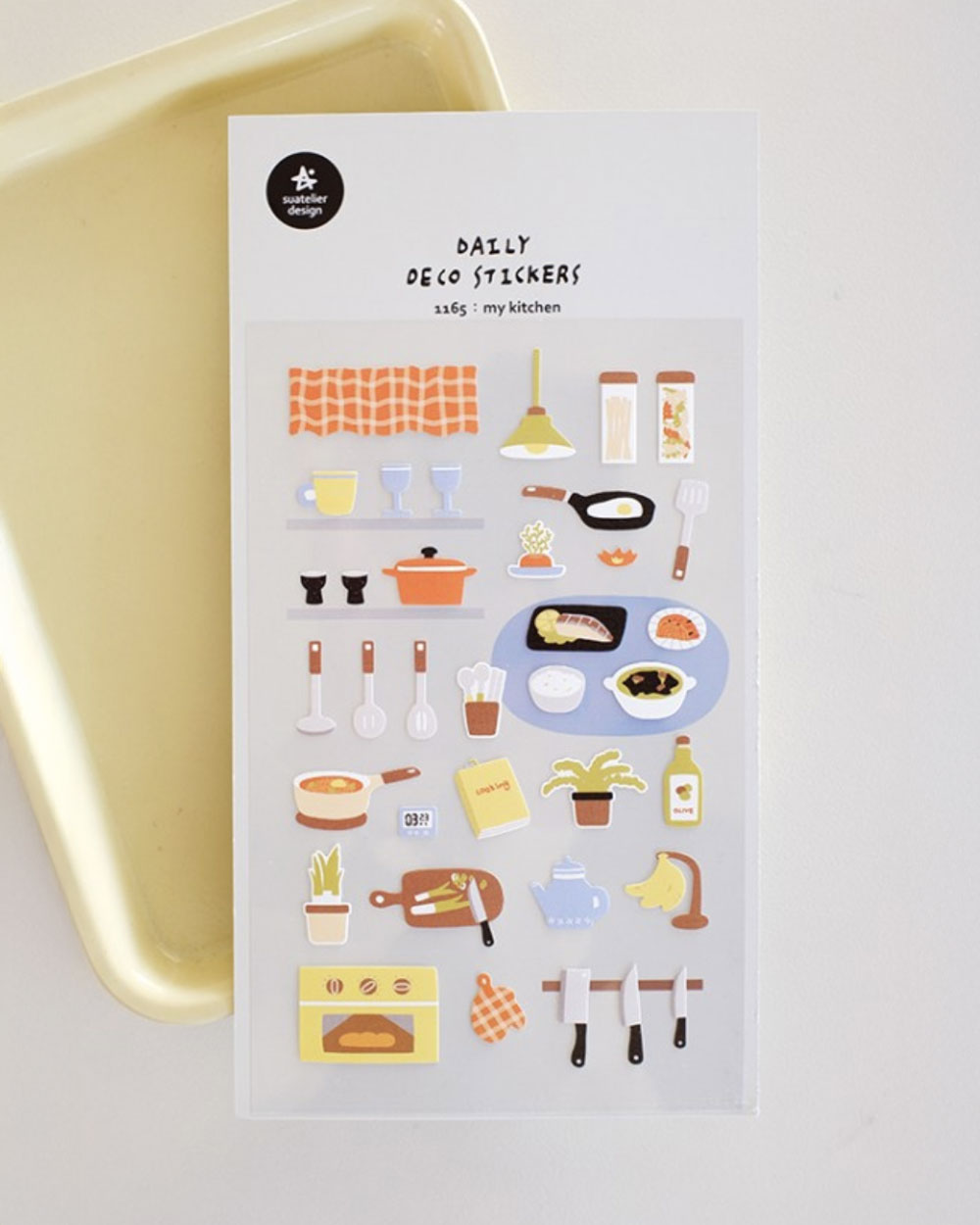 Suatelierin kuvitetussa tarra-arkissa on yhteensä 34 tarraa. Arkissa on montaa eri mallista ja kokoista tarraa, joiden teemana on keittiö ja ruuanlaitto.