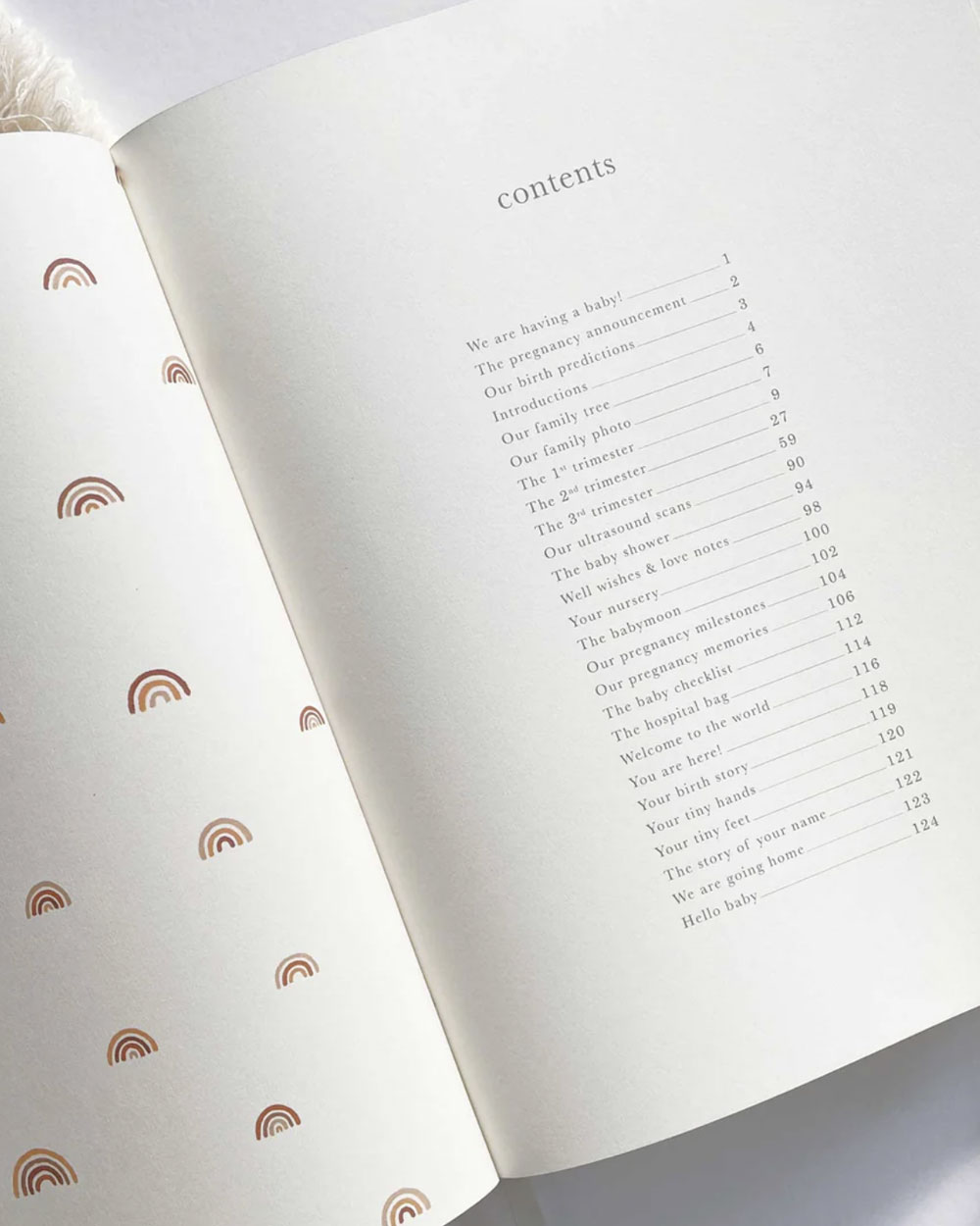Kirjassa on runsaasti tilaa valokuville sekä kaikelle tähän onnen vuoristorataan kuuluvalle: Taltioi kirjaan omia tunteita, mielialoja ja vaikka kummallisimpia ruokahimoja. Lisäksi siinä on osio, jossa voit seurata, mitä tapahtui viikoittain. Kirjasta löytyy myös tilaa myös syntymäennusteille, sukupuulle, baby shower -juhlille ja ultraäänikuville.