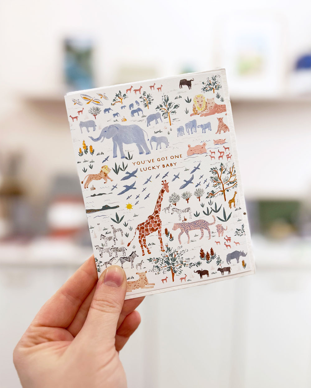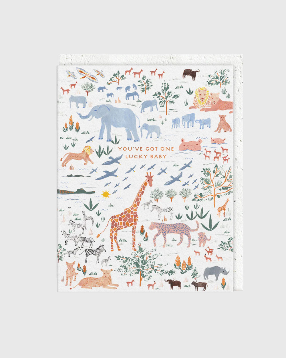 Seedlingsin kortissa on kaunis, eläinaiheinen kuvitus ja teksti ”You’ve got one lucky baby”, joka hauskasti onnittelee samalla tuoreita vanhempia.