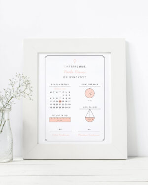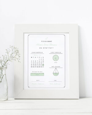Kaunis syntymäjuliste vauvan tiedoilla on ihana muisto itselle tai lahja pienokaisen tuoreille vanhemmille. Valittavana kaksi kaunista sävyä.Julisteet painetaan omassa painostudiossa Helsingissä laadukkaalle, mattapintaiselle 300 g kartongille. Juliste postitetaan suorana kartonkikuoressa.