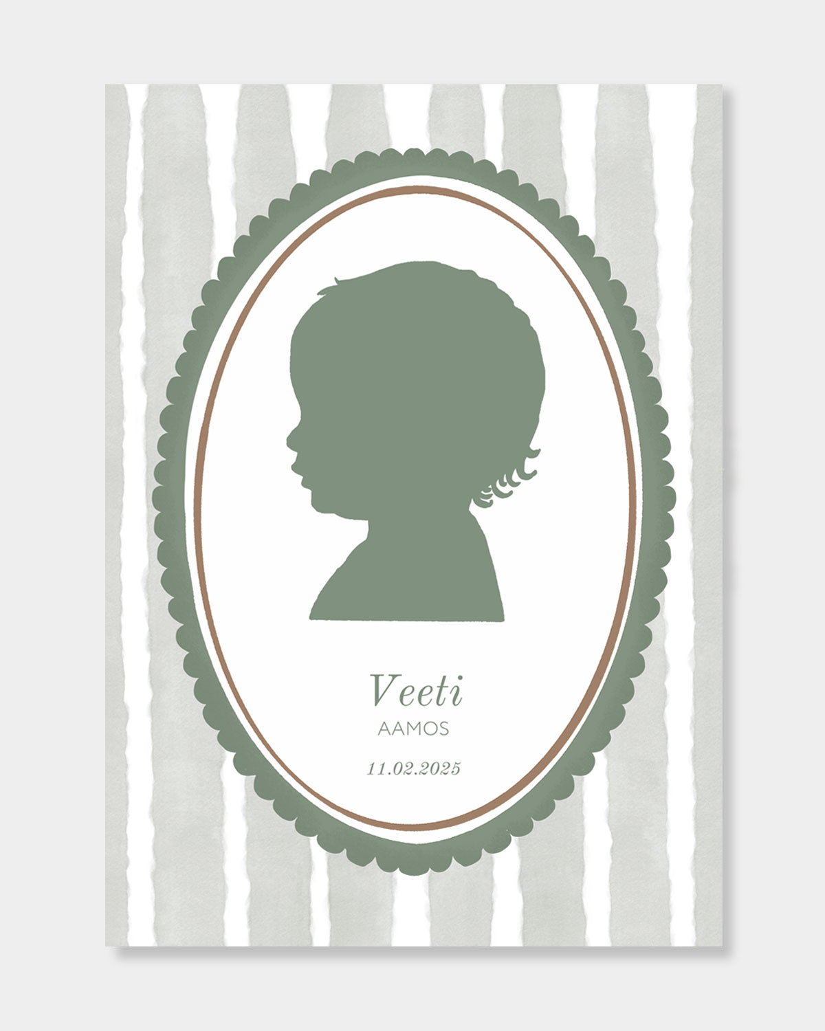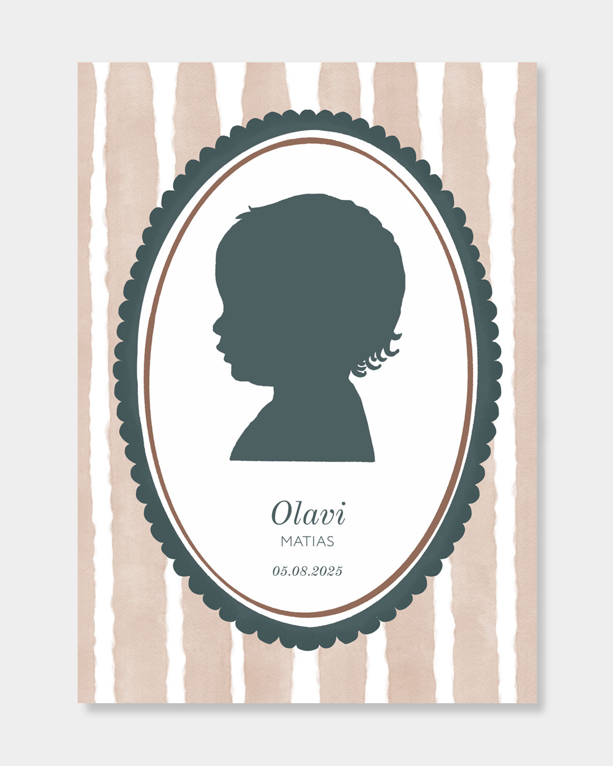 Ihana juliste lapsen siluettikuvalla on henkilökohtainen muisto joka säilyy läpi vuosien. Julisteeseen piirretään lapsen sivuprofiili sekä lisätään nimi ja syntymäpäivä.