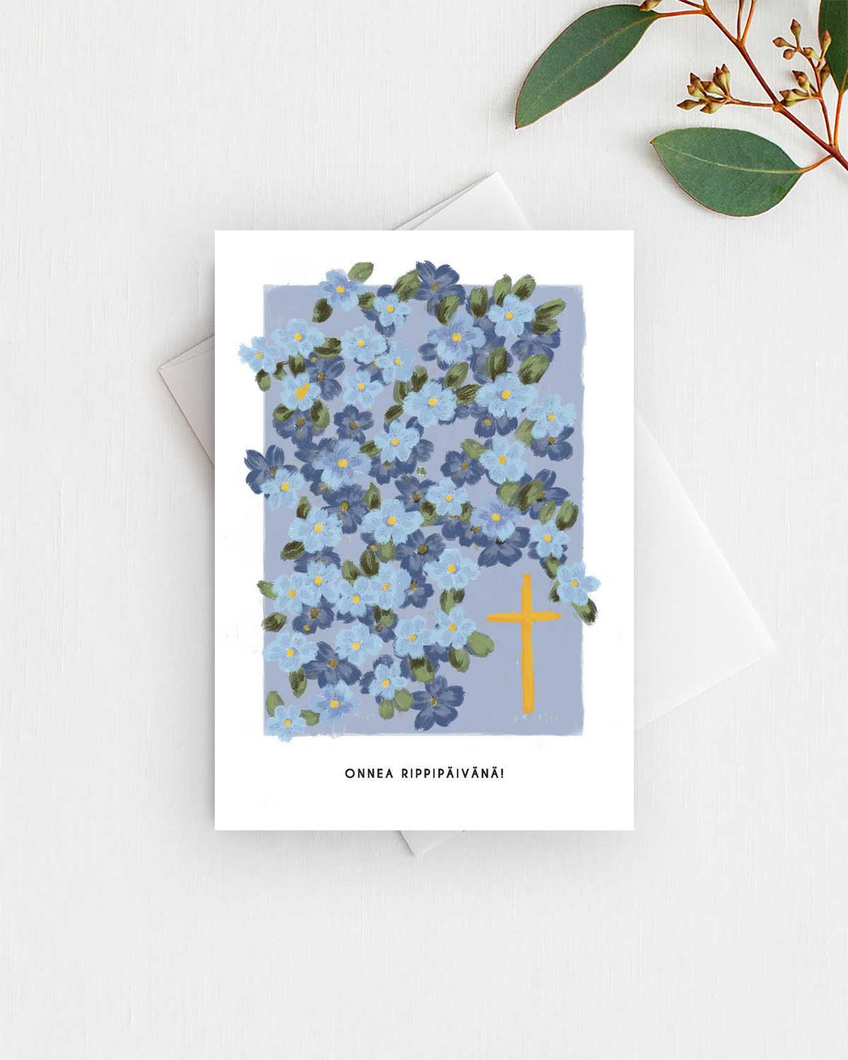 Tämän kortin kauniit kuvitukset ovat painostudiomme suunnittelijan Pepin käsialaa. Ideasta valmiiseen korttiin on monta työvaihetta. Yleensä Peppi aloittaa suunnittelun piirtämällä ja maalaamalla kuvioaiheita käsin. Koneella kuvitukset viimeistellään, sommitellaan korttikokoon ja yhdistetään fontteihin.