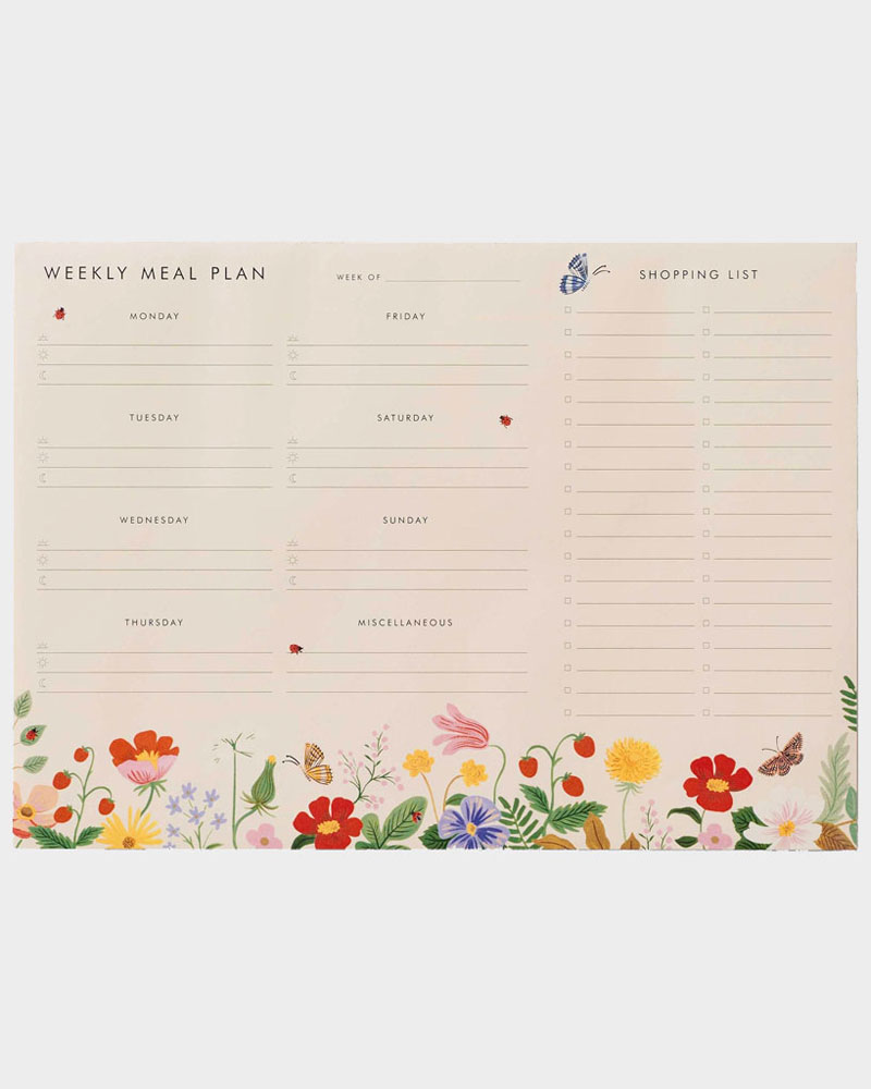 Ota viikon ruokasuunnitelmat haltuun kirjaamalla ne omiksi listoikseen! Tässä kauniissa Rifle Paperin muistilehtiössä on yksi sivu joka viikolle.
