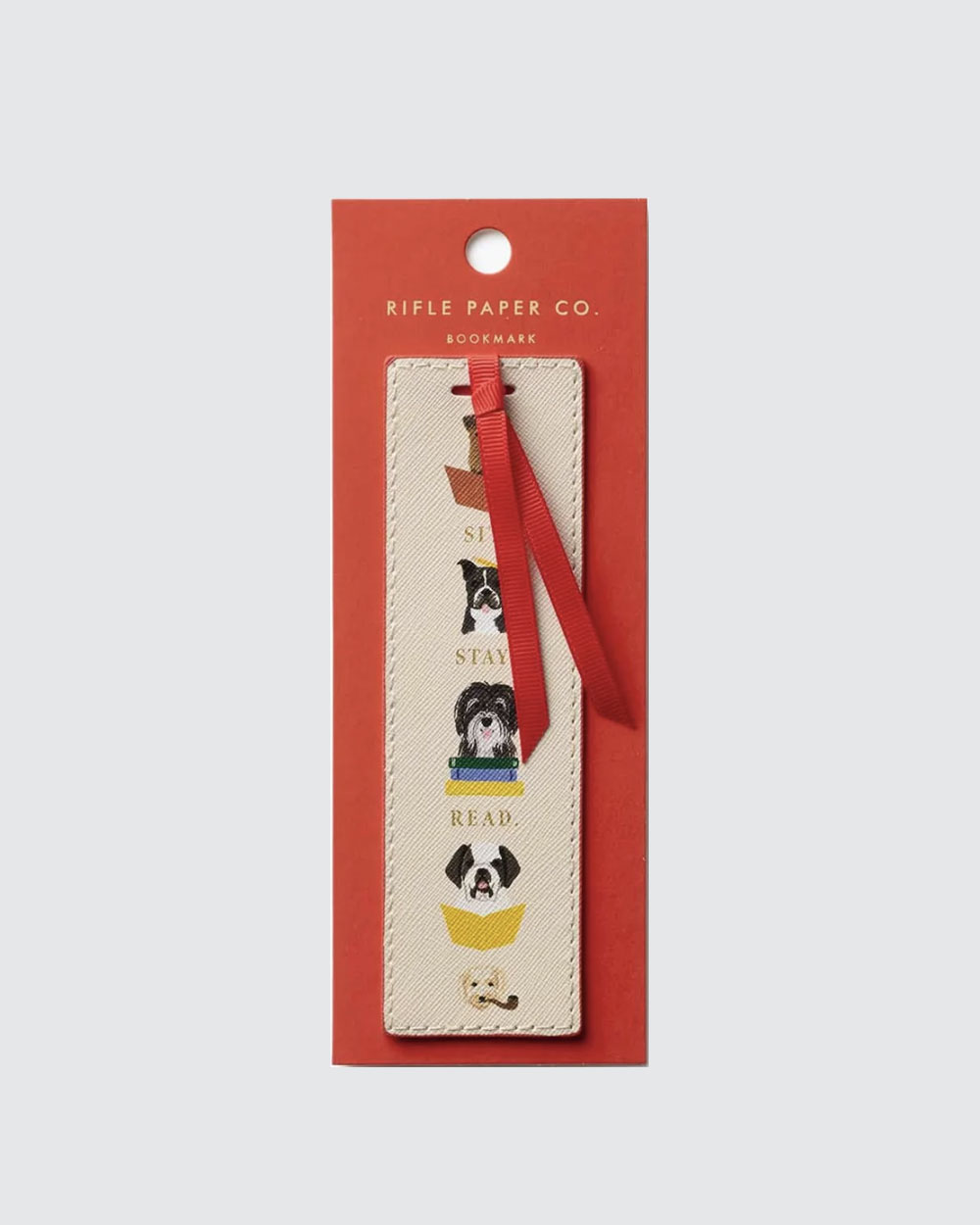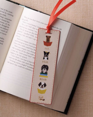 Älä enää koskaan hukkaa sivua – tässä hauskasti koirin kuvitettu kirjanmerkki ja viimeistelynä ribbinauha.
