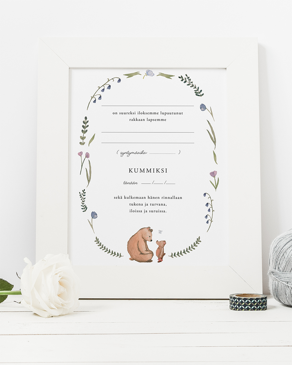 Kummijuliste on ihana muisto tärkeästä tehtävästä. A4 kokoinen juliste johon voit itse täydentää kummin nimen, lapsen nimen ja syntymäajan sekä juhlien päivämäärän.