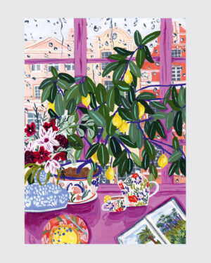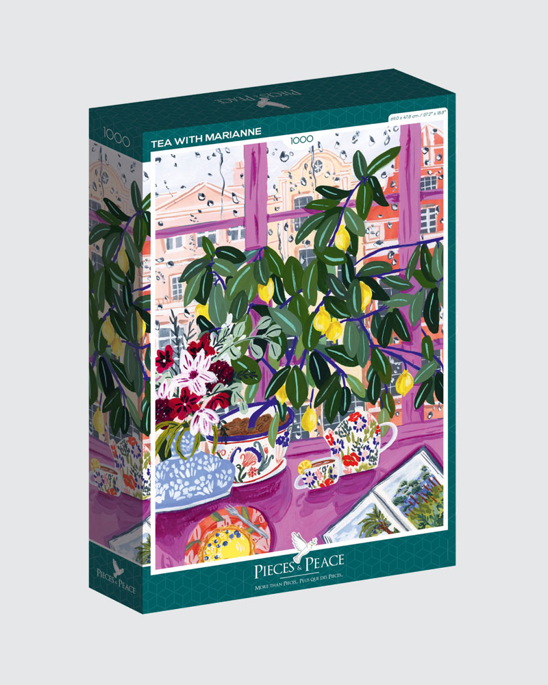 Tea with Marianne -palapelissä on ihanan runsas ja kukkaisa kuvitus. Ulkona näkyy sade ropisemassa ikkunaan ja pöydällä, sitruunapuun vieressä, on suloinen teepannu ja -kuppi. Kuvittaja-taiteilija Sarah Gesek on maalannut alkuperäisteoksen akryyleillä ja guasseilla. Sarah asuu Seattlessa, Washingtonissa ja vaikka luova ala onkin kiehtonut häntä aina tavalla jos toisella, niin nimenomaisesti maalaamisen pariin hän uppoutui vasta 2020 pandemian sulkiessa maailman.