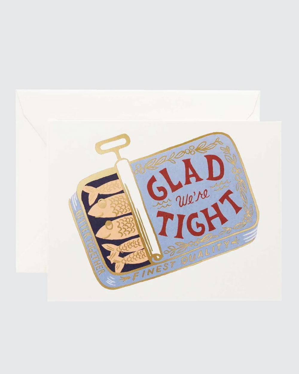 Kortin kuvituksessa ja tekstissä on englanninkielinen sanaleikki. Suomeksi emme puhu sardiineista paketissa, vaan silleistä purkissa, mutta merkitys on sama: Jotain on hyvin tiiviisti lähekkäin. Kortin tervehdys ”Glad we’re tight” tarkoittaa, että olen onnellinen kun olemme läheisiä ja meillä on tiivis suhde.