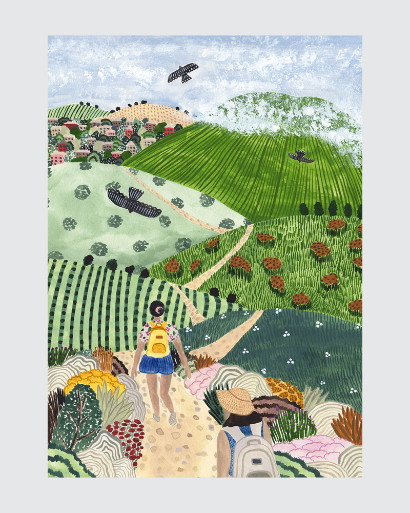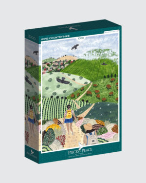 Wine country hike -palapeli vie kokoajan mukanaan upeisiin peltomaisemiin kukkulalta toiselle. Palapelin kuvittaja Sara Boccaccini Meadows on Brooklynissa asuva printtisuunnittelija, joka on kotoisin Englannista. Hän ammentaa inspiraatiota luonnosta ja arjen pienistä yksityiskohdista luodakseen ainutlaatuisia ja persoonallisia kuvituksia, joissa käytetään vesi- ja guassivärejä sekä mustetusseja.